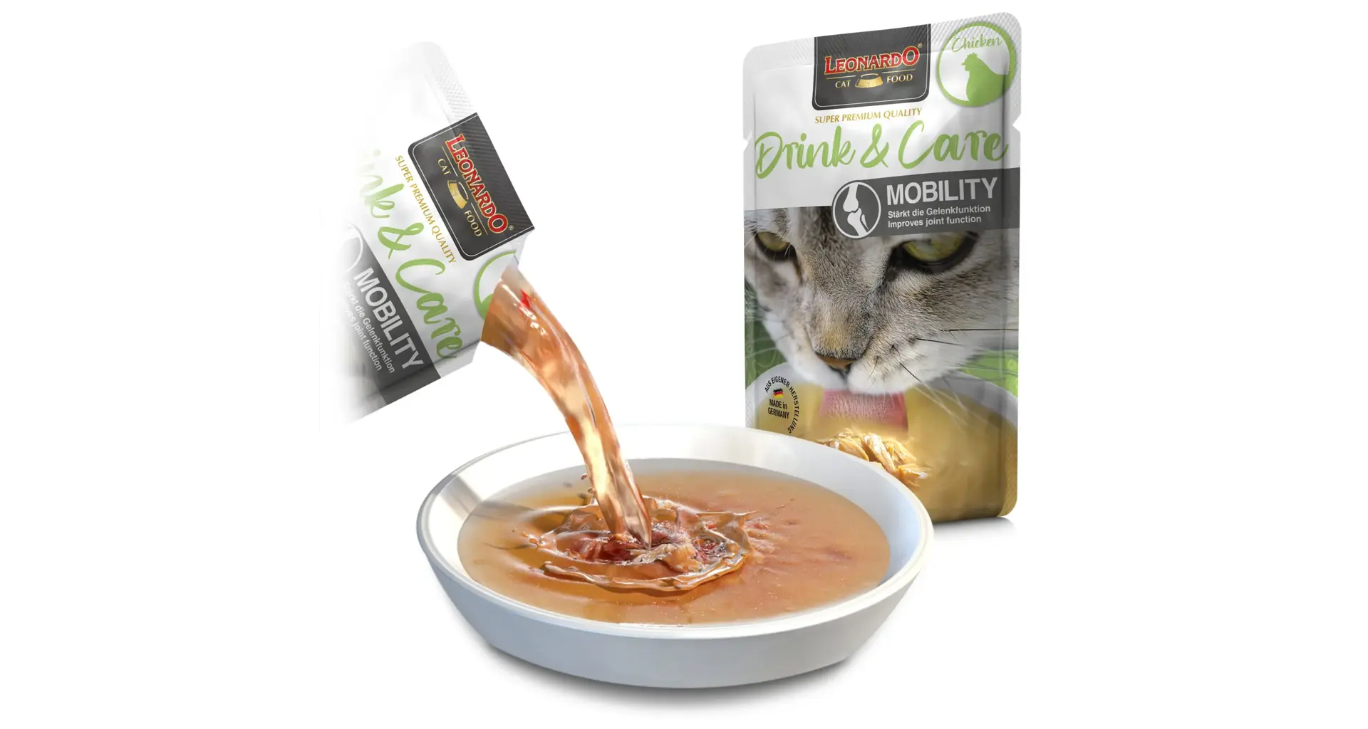 Kuřecí drink pro flexibilní tlapky a pružné klouby. Voňavý kuřecí vývar s kousky masa pro svižnější pohyb, zdravé klouby a elegantní krok vaší kočky.